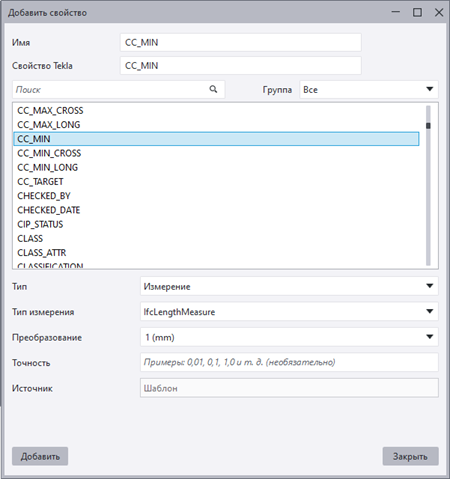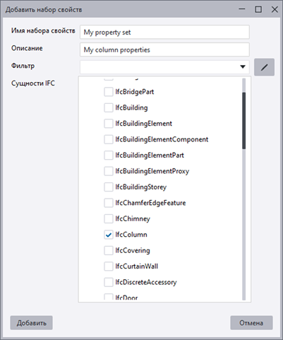 Можно создать наборы свойств из атрибутов шаблонов и пользовательских атрибутов, задать свойства для атрибутов, а также привязать наборы свойств Tekla Structures к объектам IFC для экспорта в IFC. Наборы свойств можно сохранить в файлах конфигурации наборов свойств.