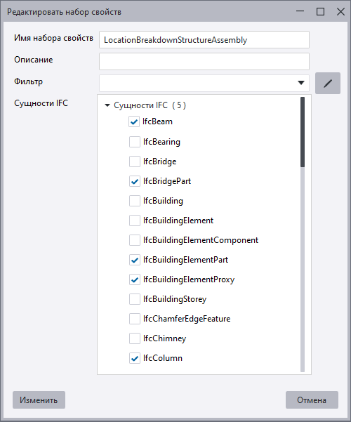 Добавить наборы свойств buildingSMART. Наборы свойств, начинающиеся с Pset_ или Qto_, представляют собой наборы свойств buildingSMART. Наборы свойств buildingSMART защищены, и вы не можете изменять объекты IFC, с которыми они экспортируются, или редактировать имена содержащихся в них свойств. Однако можно редактировать свойства в наборах свойств buildingSMART, а также включать или исключать их.