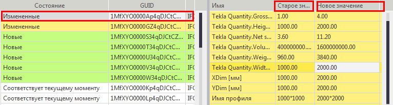 Появятся список изменений и список сведений о свойствах. Содержимое списка изменений основывается на содержимом IFC и включает в себя все типы физических объектов. Цвета в нем те же, что в списке Обнаружение изменений.