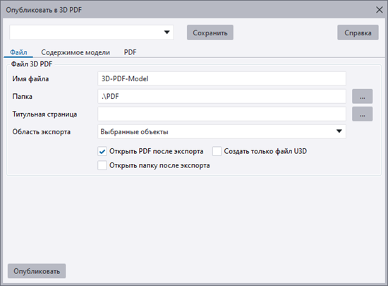 Экспорт модели или выбранных объектов модели в виде PDF-файла 3D