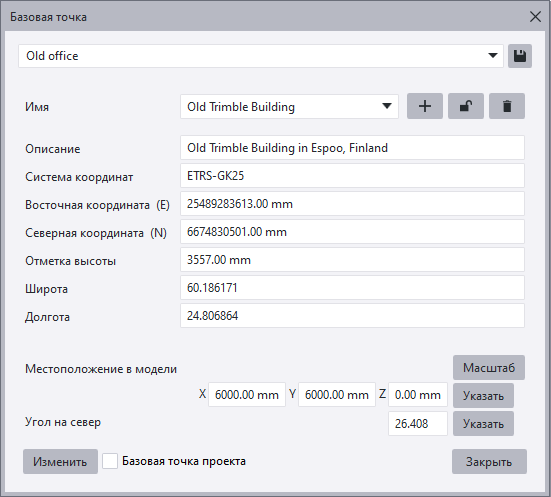 - Выберите в списке базовую точку, которую вы хотите использовать, начало координат модели или текущую рабочую плоскость.