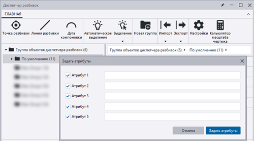 В новом диалоговом окне Задать атрибуты можно добавлять пользовательские атрибуты к группам точек, чтобы упростить идентификацию объектов на строительной площадке и управление ими. Щелкните группу в Диспетчер разбивок правой кнопкой мыши, чтобы открыть диалоговое окно.