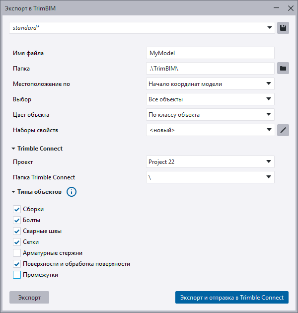 Теперь можно создать файл TrimBIM (.trb) прямо в Tekla Structures и выбрать включенные в него наборы свойств IFC.