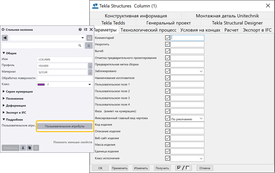 Панель свойств и многие диалоговые окна содержат пользовательские атрибуты для различных объектов, в том числе балок, колонн, болтов и чертежей. Tekla Structures отображает эти поля при нажатии кнопки Пользовательские атрибуты на панели свойств или в диалоговом окне.