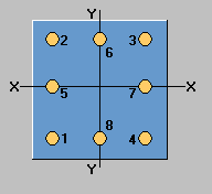 Specify strand-centerline-to-surface dimension, de. For corner strands 1-4, this distance defines the strand centerline position relative to both adjacent column faces. For strands 5-8, the strand is located on the face centerline, offset from the face by distance de.