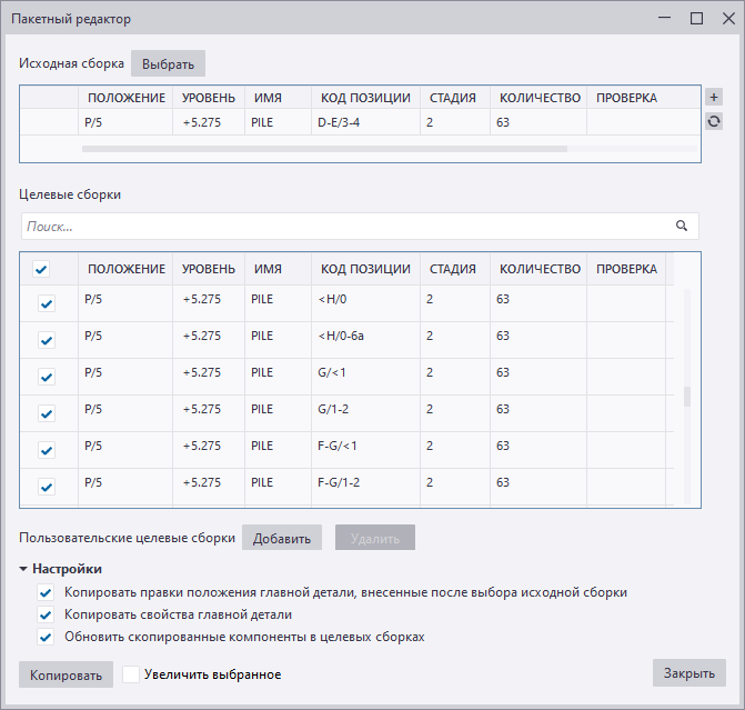 Выбрать исходную сборку или ЖБ элемент в модели и на основе этого исходного объекта сгенерировать список целевых сборок или ЖБ элементов, в которые вы можете скопировать правки, внесенные в исходный объект. Пакетный редактор выявляет только сборки или ЖБ элементы с тем же номером позиции, что и у исходного объекта.