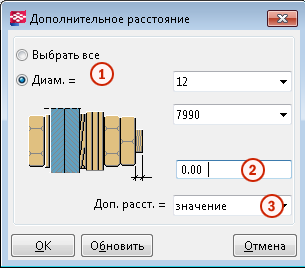 Параметр Дополнительное расстояние позволяет управлять тем, на сколько болт выступает за гайку. При изменении параметра Дополнительное расстояние обновляются значения параметра Дополнительное расстояние для всех болтов, которые относятся к выбранному стандарту болта и имеют выбранный диаметр. Это значение используется при вычислении длины болта. |