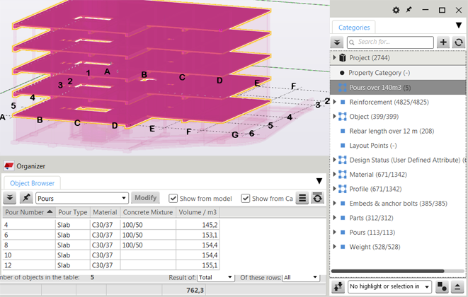 Иногда бывает так, что объемы в модели случайно выходят за некоторые пределы. Такими пределами могут быть суточные норма бетонирования и объем подвоза бетона. Для отслеживания этих пределов можно использовать Организатор.