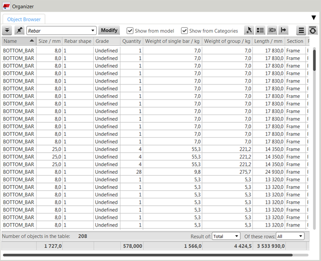 В данном примере максимальная длина арматуры на нашем складе составляет 12 метров. Все арматурные стержни в модели, следовательно, должны быть не длиннее 12 метров. С помощью средства Организатор можно выявить арматурные стержни, длина которых превышает 12 метров.
