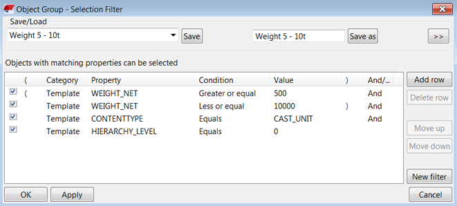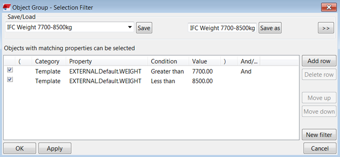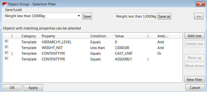 Аналогичную процедуру можно применять к объектам Tekla Structures — например, для отслеживания веса и стальных сборок, и отлитых элементов с помощью одного фильтра. Ниже приведен пример такого фильтра.