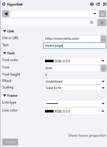 Tekla Structures adds the link to the selected drawing inside a resizable frame using the defined properties. You can open the linked drawing by double-clicking the link. To modify the drawing link properties, click the link frame.