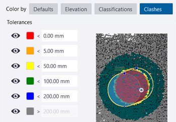 • In Visualization settings - Clashes, check clashes and deviations by using different colors for different tolerances. You can detect points that are inside or within a distance from the selected parts and selected reference model objects based on the settings you define. Clash check between point clouds and pour objects is also supported.
