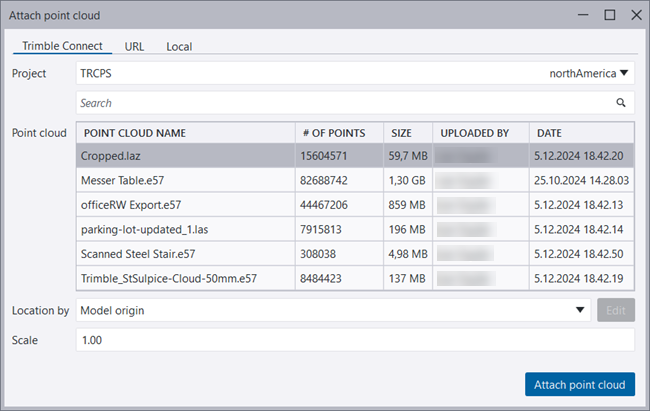 • When you attach and show point clouds stored in Trimble Reality Capture platform service (TRCPS), you do not need to store large point clouds files locally on your computer but you can attach point clouds hosted in an existing Trimble Connect project.