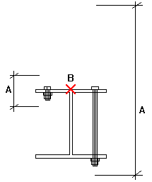 Tekla Structures searches for parts using half the cut length value, in both directions from the bolt group plane. In the illustration below, A is the cut length and B is the bolt origin. Tekla Structures calculates the search area as A/2 in both directions from point B.