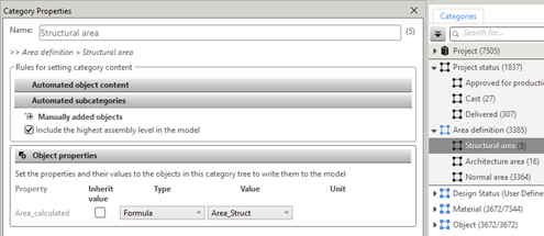 Add all model objects to the property category, and create subcategories for the different area calculations you need. You can use object or assembly type of categories according to your needs. To use assemblies, select the Include the highest assembly level in the model option in the category properties.