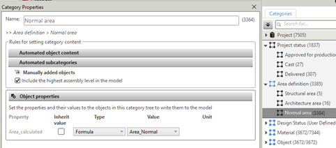 6. Add the property and the formulas you created to the Area definition categories to write the UDA values to the model objects.