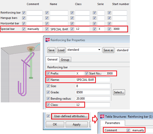 You can add the created reinforcement as a rebar assembly to the cast units with a predefined assembly type, name, prefix, and start number.