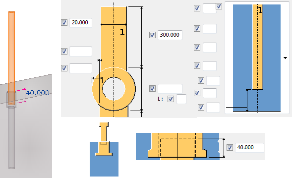 Use the diameter and height boxes to define the shape of the top part of the embed. You can define the main diameters of parts 1, 2, 3, 4 and 5 also on the Parts tab.