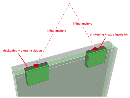 Cast-in wire rope lifting hoops that are custom parts. Adjusting anchors are in the front side. The component is applied two times. |