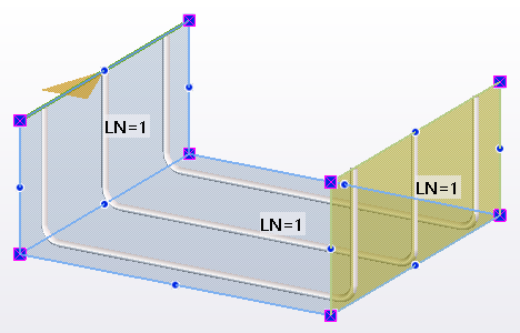 Tekla Structures shows the leg faces and leg surfaces. Tekla Structures also shows the bar layer numbers of the rebar set on each leg face or leg surface, for example LN=1.