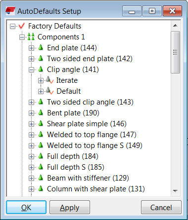 AutoDefaults only affects connection parts (clip angles, shear tabs, end plates, …), bolts, and welds. AutoDefaults cannot change beam profiles or the connection number.