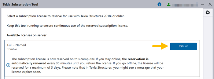 The subscription license is reserved. Keep the Tekla Subscription Tool running while you are using your subscription with a legacy version of Tekla Structures. If you stay online, the reservation is automatically renewed until you return your license.