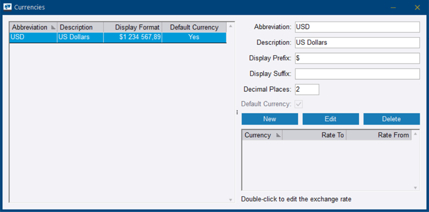 请注意,选定货币的默认货币列现在显示是。