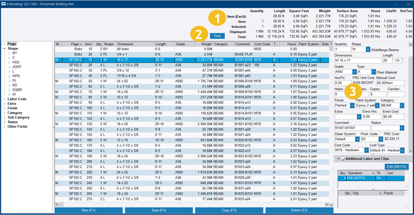 (2) 查找:单击查找任务中的对象。您可以选择是否要查找具有特定形状、材料等级或材料尺寸的对象,或者查找任务中的某个特定对象。有关详细信息,请参阅查找估算对象。