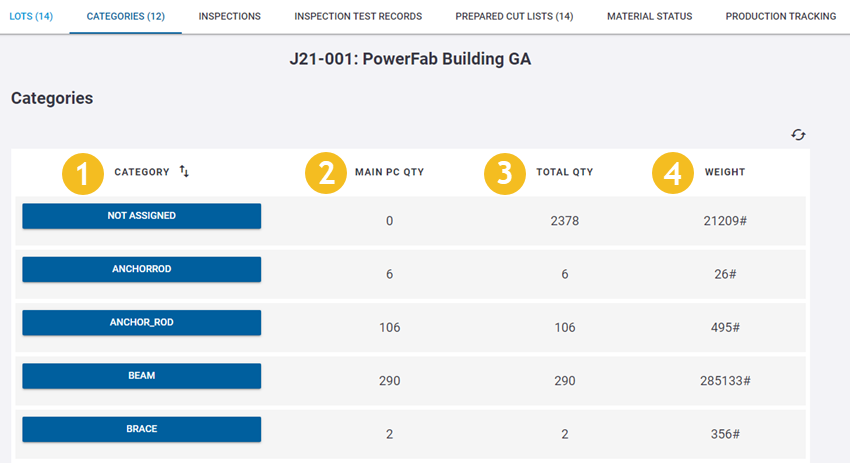 在 Tekla PowerFab Go 中,您可以查看任务中对象的类别和子类别。