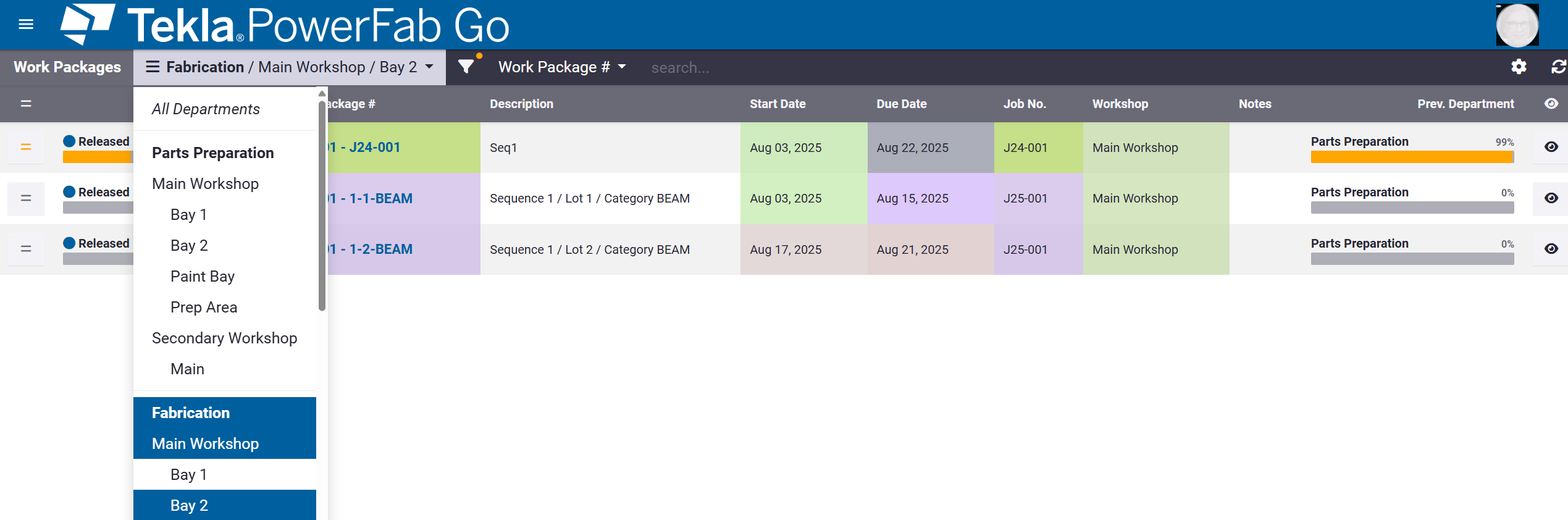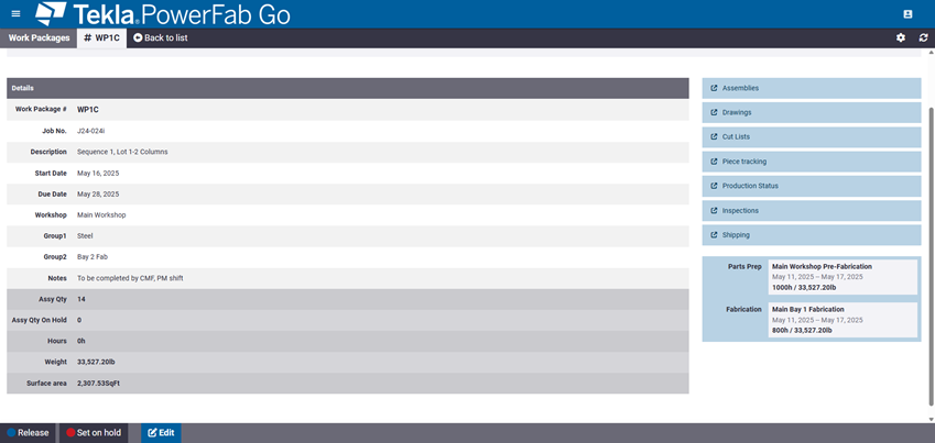 作为生产经理,您可以查看工作包并调整其优先级,将它们重新分配到新的车间,以及待定工作包。作为车间工作人员,您可以查看相关工作包列表并针对特定工作包访问 Tekla PowerFab Go 的关键区域,包括图纸、构件和零件、切割清单、生产跟踪、生产状态、检验、运输和控制面板(需要获得权限)。