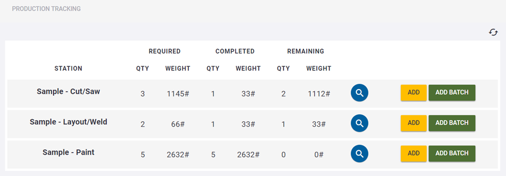 系统将显示选定任务中的工作站列表。您可以查看工作站完工所需的对象总数和重量、工作站已完工的对象总数和重量,以及工作站仍有剩余且尚未完工的对象总数和重量。