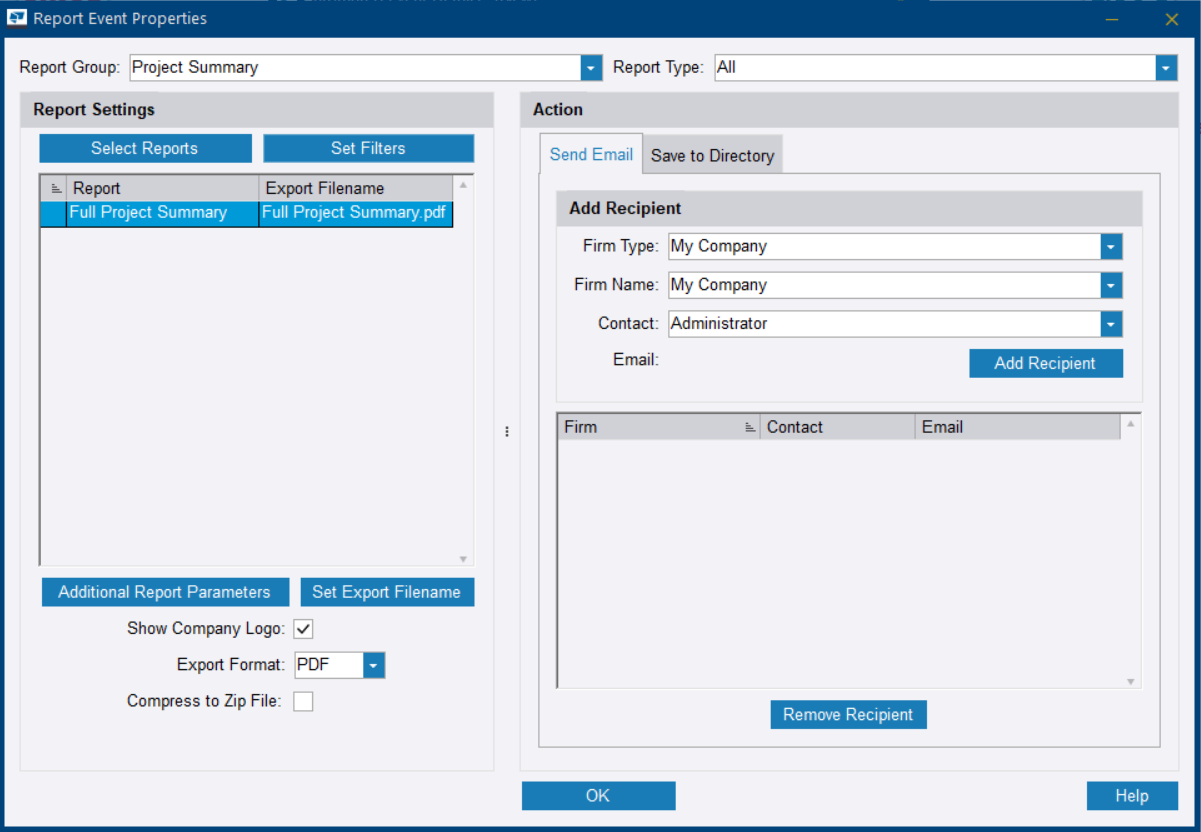要通过电子邮件发送报告,请在发送邮件选项卡上选择公司类型、公司名称和联系人,然后单击添加收件人。