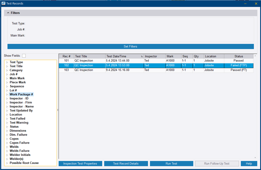 运行后续测试 检验测试失败,并且原始问题已得到解决后,您可以执行后续测试。可执行的后续测试数量不受限制。 在生产控制模块中,打开一个任务。 在生产控制功能区选项卡上,单击审查 > 检验测试记录。 测试记录对话框随即打开。 单击要为其添加后续测试的检验测试记录。 单击运行后续测试。 新检验测试记录对话框随即打开。 修改测试属性。 请参阅检验测试记录属性。 单击保存。 添加了成功的后续测试记录后,所有先前失败的测试记录的状态都将更新为“失败 (FTP)”,这表示后续测试已通过,失败情形不再处于未解决状态。 See also检验测试记录检验测试记录属性Tekla PowerFab Go 中的一般检验检验测试状态