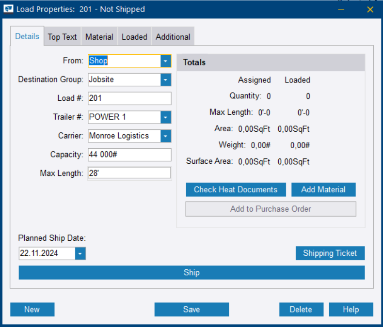 已装运选项卡列出了所有已装运的对象,包括装运日期及其数量和重量。其中还包括工作包。