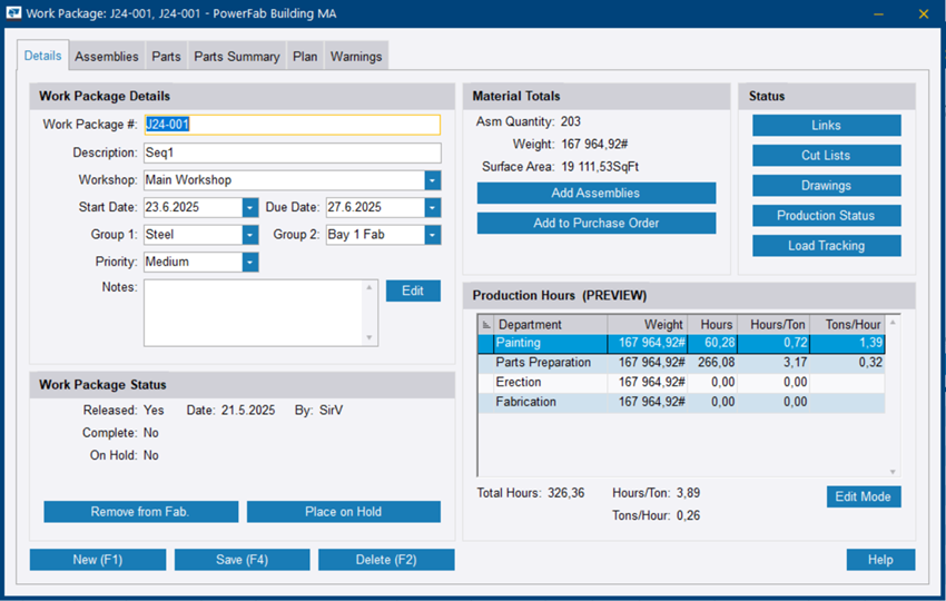 如果生产控制任务已链接到估算,系统会根据在构件零件级别分配的生产代码自动生成生产工时。