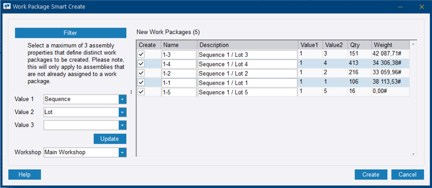 Smart Create 工具可加快工作包的创建速度,特别是工作包创建标准很少的简单任务。您最多可以选择三个可组合的属性来创建工作包列表。
