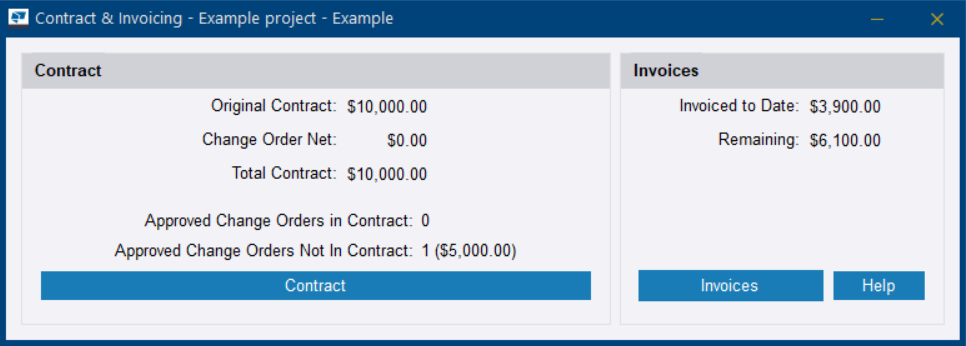 管理合同和发票信息 您可以在合同与发票对话框中查看当前合同和发票信息,添加新的合同详细信息和发票,或者修改合同和发票信息。 在合同与发票对话框中,您可以查看合同的总金额、合同中包含或未包含的已批准变更单、已开具发票的金额,以及合同中的剩余金额。 要访问合同和发票信息,请执行以下步骤: 打开一个项目管理任务。 项目对话框随即打开。 执行以下任一操作: 在项目设置选项卡的管理区域中,单击合同与发票。 在汇总选项卡的管理区域中,单击合同与发票。 合同与发票对话框随即打开。 要处理合同,请参阅管理合同信息。 要处理发票,请参阅管理发票。