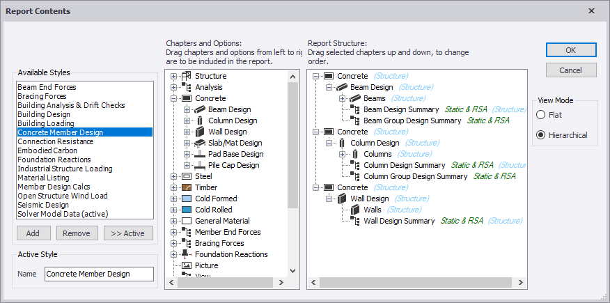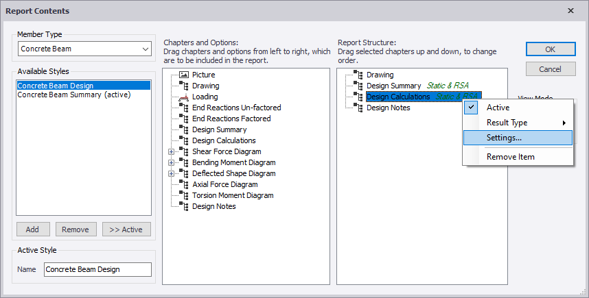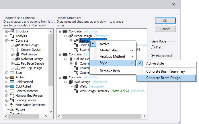 To add concrete member design calculations to any model report, in the Report Contents dialog box, select the report style, then open the Concrete chapter and drag the Beam Design, Column Design and Wall Design chapters in the report structure.