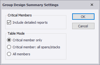 The group summary tables can optionally be followed by member design reports for either the critical member only, all spans/stacks of the critical member, or all members. These options are set by right clicking on the group design summary sub-chapter and selecting Settings from the context menu.