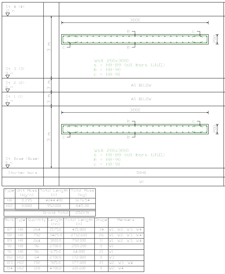 Concrete Wall Detail - this drawing variant can be created by right-clicking on the required wall and selecting Generate Drawing from the context menu. The drawing displays the reinforcement in the wall elevation and section and includes a table of bar quantities.