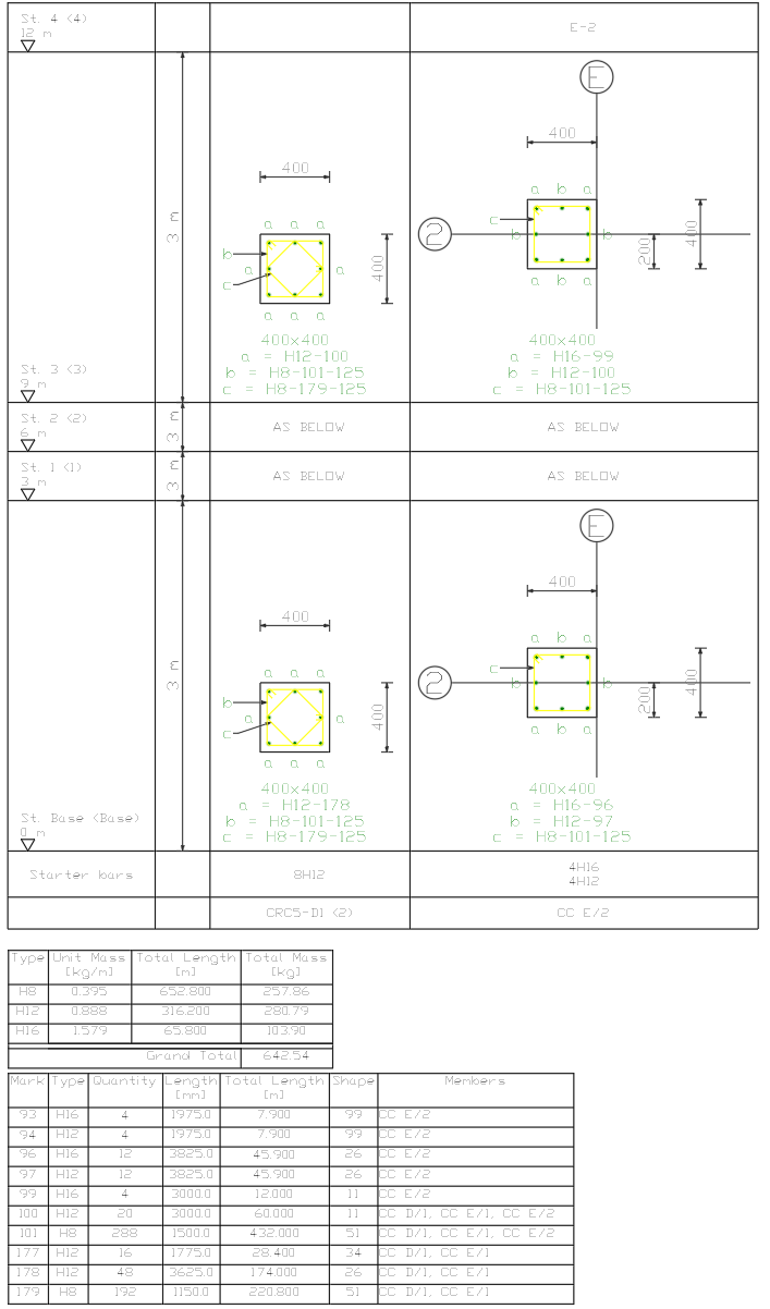 Concrete Column Detail - this drawing variant can be created by right-clicking on the required column and selecting Generate Drawing from the context menu. The drawing displays the reinforcement in the column elevation and section and includes a table of bar quantities.