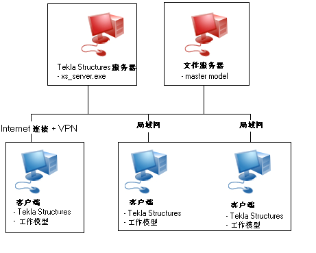 多用户模型是由单个主模型 组成的。每个用户都可以访问这个模型,并可以打开该模型的本地视图。该本地视图称为工作模型。上图显示了多用户系统的一种可能配置。