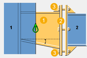 次零件可以是倾斜的。可以创建顶部和底部腋板。 1 次零件腹板未指向柱的中心(顶视图)。 2 次零件腹板与未与水平的柱垂直(顶视图)。 3 次零件腹板未与垂直的柱垂直(侧视图)。 |