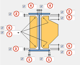 规则梯形节点板。 您可以使用节点板选项卡页上的所有间隙和平直部分设置来修改此节点板。 如果节点板延伸到上翼缘以上或下翼缘以下,请使用延长节点板折角尺寸代替节点板翼缘的直边尺寸。 |