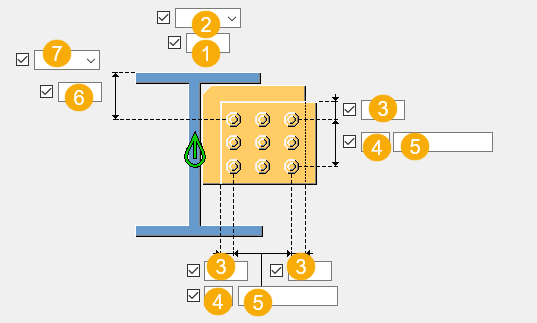 默认情况下,高度由螺栓组垂直边距定义。 如果您未输入宽度,则将根据翼缘宽度定义加劲肋宽度。加劲肋厚度的默认值为腹板厚度。 |