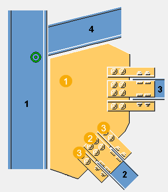 定义在上下翼缘上创建的垫板编号。 输入垫板型材编号:1、2 或 3。这些是垫板选项卡上半部分中的编号。 例如,如果要在上翼缘创建三个垫板,并且希望使用两次垫板 1 和一次垫板 1,请输入 1 1 2。您输入的第一个数字是最靠近支撑翼缘的垫板。 |