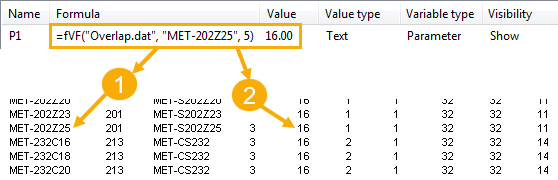 =fVF("Overlap.dat", "MET-202Z25", 5) 函数位于变量对话框的公式框中。函数从 Overlap.dat 文件,为截面 MET-202Z25 获取值 16.0。