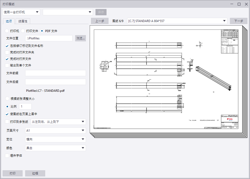 打印图纸 您可以将图纸打印为 PDF 文件,将它们另存为打印文件 (.plt) 以便使用打印机/绘图机进行打印,或在选定的打印机上进行打印。Tekla Structures 会在打印图纸对话框中提供图纸实时预览。此外,您还可以更改输出颜色和线宽。 打印限制 在打开的图纸中,您只能预览和打印当前图纸。如已打开一张图纸,您还可以再打开一张图纸(例如,双击文档管理器中的另一张图纸),但可能无法更新预览。再次在文档管理器中选择此图纸(单击),此时预览会更新以匹配选择内容。 另请参见 打印为 PDF 文件、打印文件 (.plt) 或打印到打印机创建和编辑图纸布置打印配置文件自定义打印文件名使用打印机目录打印机实例打印图纸(原打印)