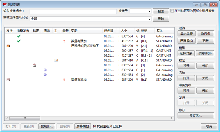 在 图纸列表 对话框中,您可以根据不同的标准搜索、排序、选择和显示图纸,并打开列表中显示的图纸。您可以获取图纸的截屏,在模型中找到各图纸部分,并确定某个部分是否包含在任一图纸中。