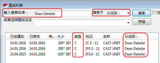 在下面的示例中,您想要查找已分配到 Dean Detailer 的所有浇筑体图纸: